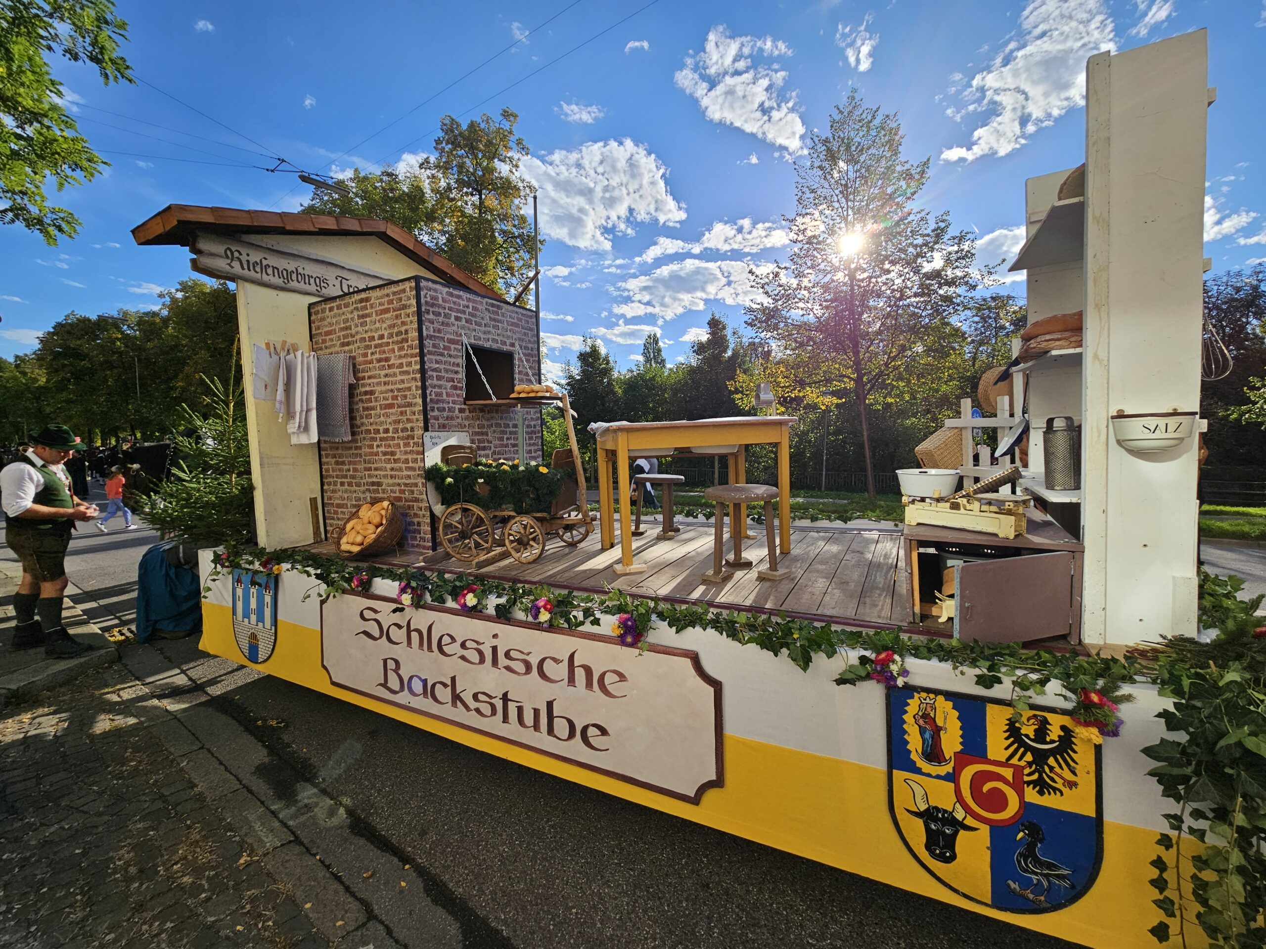 Mit der Zugnummer 58b reihten wir uns im hinteren Teil des farbenfrohen Trachten- und Schützenzugs ein. Unter dem Motto „Das Beste kommt zum Schluss“ wurden wir von den zahlreichen Zuschauern entlang der Strecke mit ebenso viel Applaus und Freude empfangen wie die Gruppen vor uns. Den Auftakt unserer Gruppe bildete der diesjährige Festwagen, der – mit viel Liebe zum Detail in vier Tagen gebaut – unter dem Motto „Schlesische Backstube“ eine traditionelle Bäckerei-Szene zeigte. Ausgestattet mit originalgetreuen Requisiten, Backwerk und alten Gerätschaften entstand ein liebevolles Bild vergangener Handwerkskunst. Besonders beliebt beim Publikum: ein Bäcker und eine Bäckerin in historischem Gewand, die während des gesamten Zuges Teig kneteten und fröhlich den Zuschauern zuwinkten.